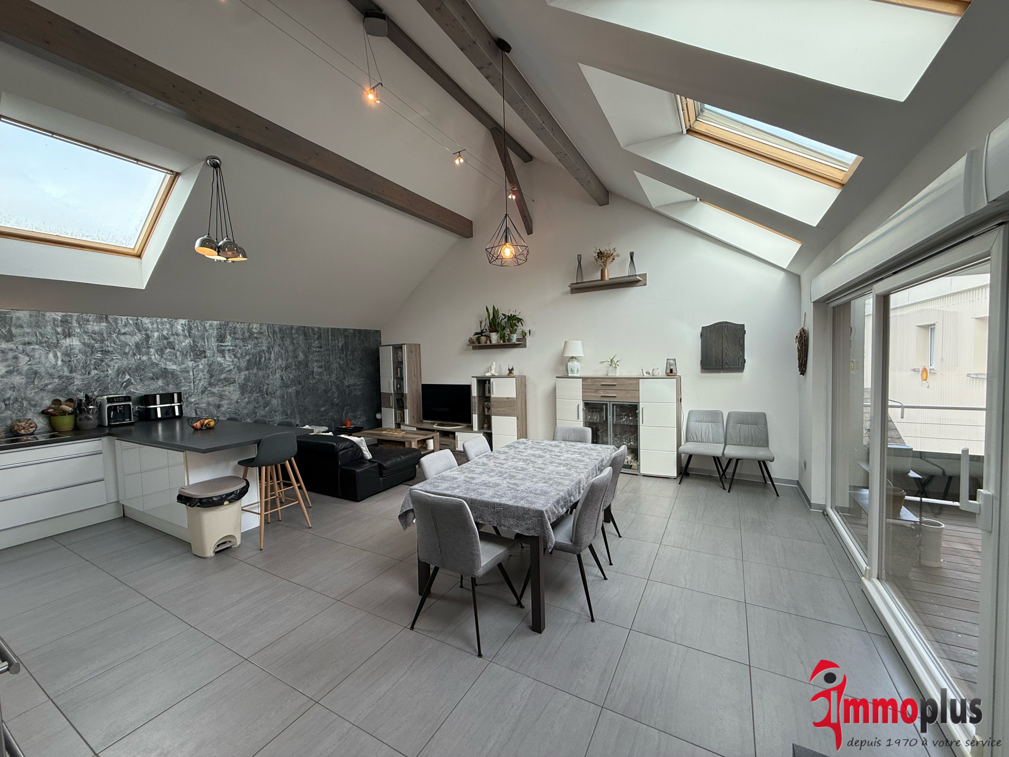 À l'étage : Deux chambres à coucher, une grande salle de bains équipée d'une baignoire/grande douche à l'italienne/double vasque/toilette et espace lave-linge/sèche-linge. Dans l'extension, une superbe pièce à vivre de 50 m² avec une cuisine, complètement équipée et ouverte sur le séjour salle à manger muni de quatre grands Velux motorisés et qui donne accès, par baie vitrée, à une agréable terrasse de 20 m² !